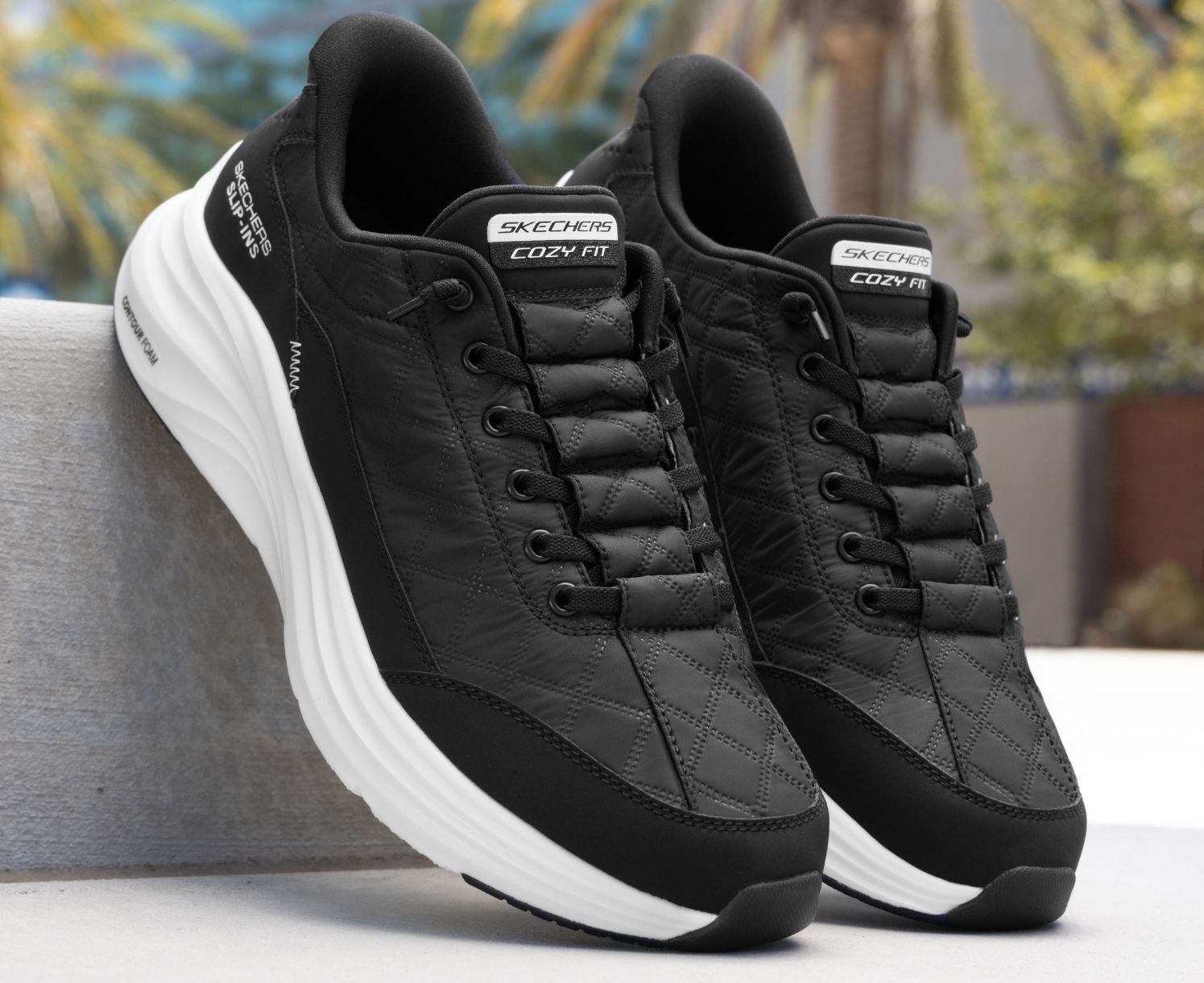 Skechers Cozy Fit® premium soft quilted materials wrap your feet in luxury, providing a cozy, natural fit for ultimate comfort.