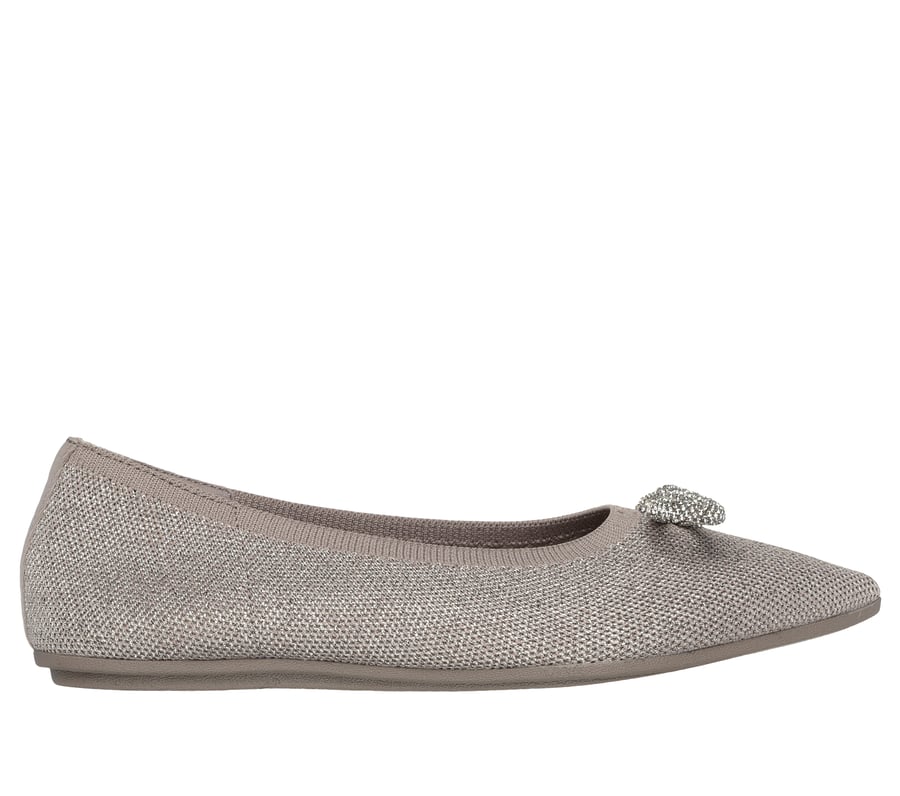 Go green in sparkly eco-friendly style wearing Skechers Cleo® Point - Glitzy Haze. This product's upper is made with at least 20% recycled content by weight, which helps to reduce waste, this vegan Stretch Fit® skimmer features a metallic knit upper with a bow front and a cushioned Skechers Air-Cooled Memory Foam® insole. Our Planet Matters®: Good for your feet. Good for the world.®