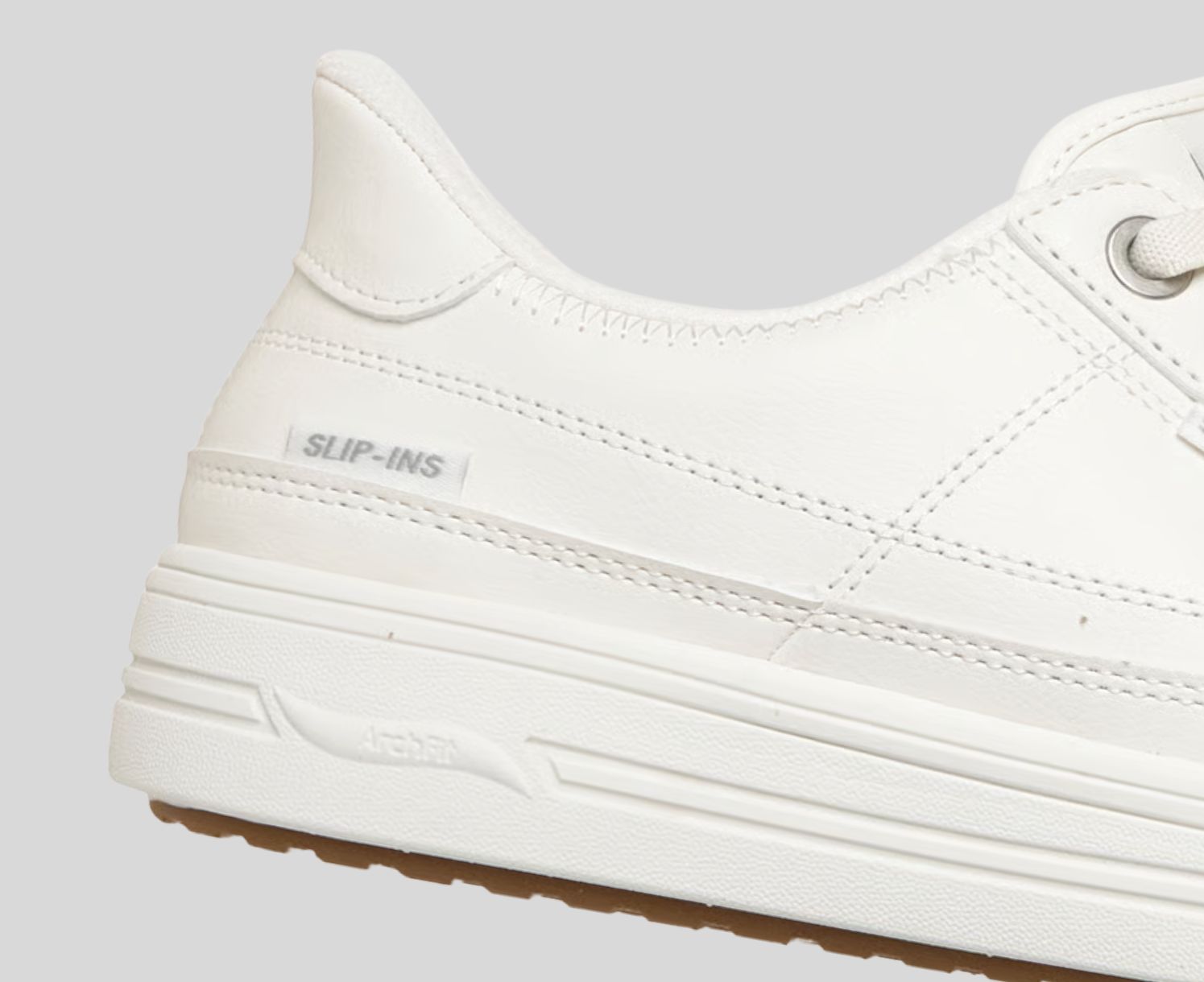 STEP-N-GOS Stroll through the day in amazing cushioned comfort wearing Skechers Street Hands Free Slip-ins®: Arch Fit® Arcade - Catch Ya There. Designed with our Heel Pillow®, this casual slip-on sneaker has been granted the APMA Seal of Acceptance and features a duraleather upper with fixed stretch laces, a removable Arch Fit® insole, and a lightweight cushioned midsole.