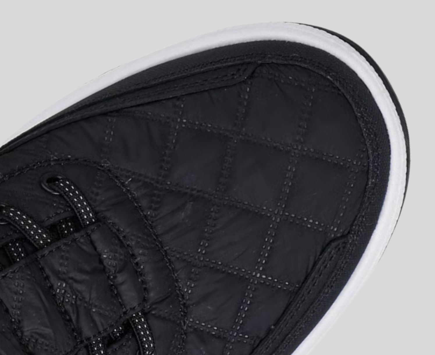 - Quilted fabric, synthetic, and leather upper with tied-off stretch laces