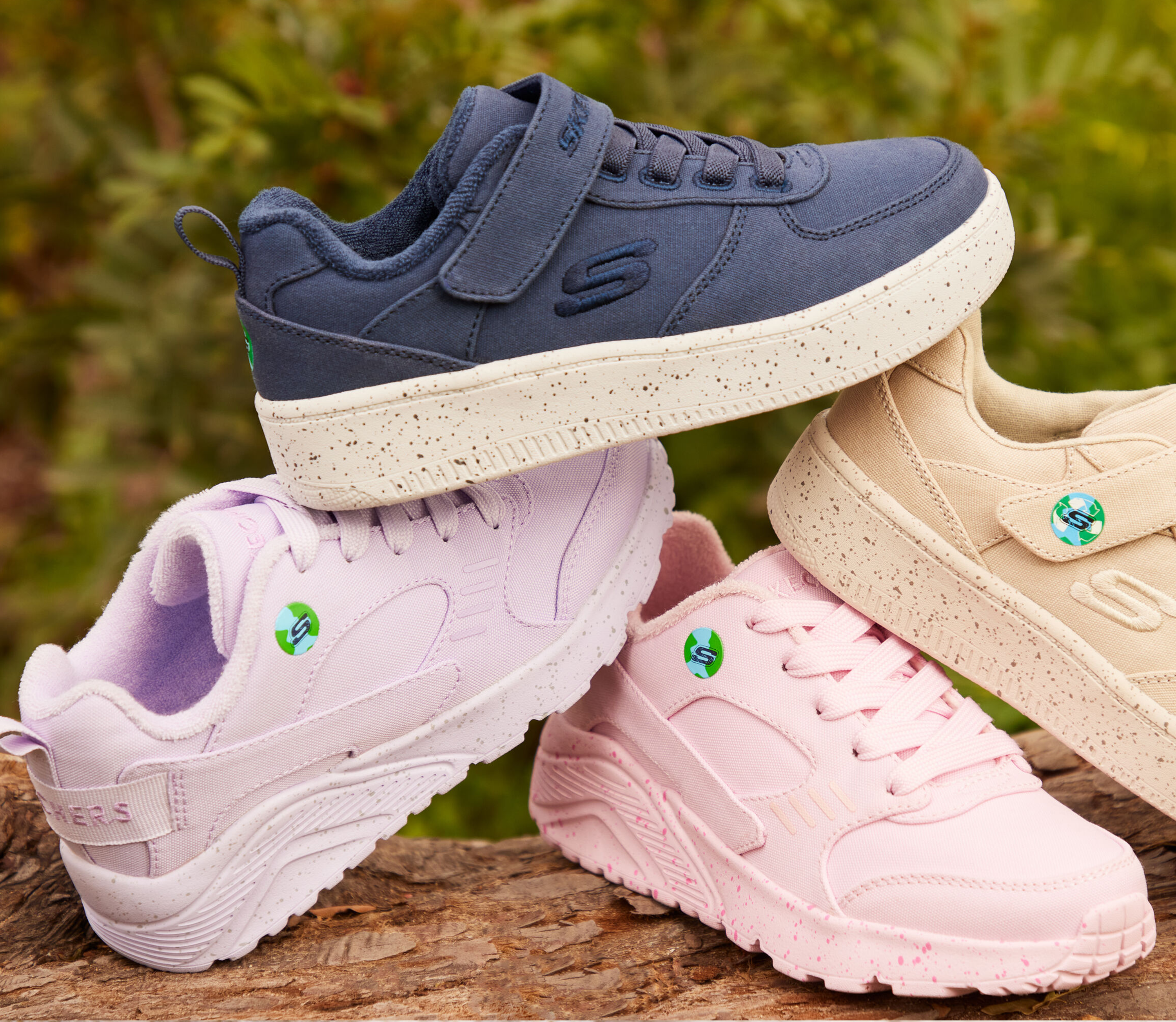 スケッチャーズのOur Planet Matters ™コレクションは、メンズ、ウィメンズ、キッズのシューズに持続可能なリサイクル素材を使用し、環境への影響を軽減しています。
